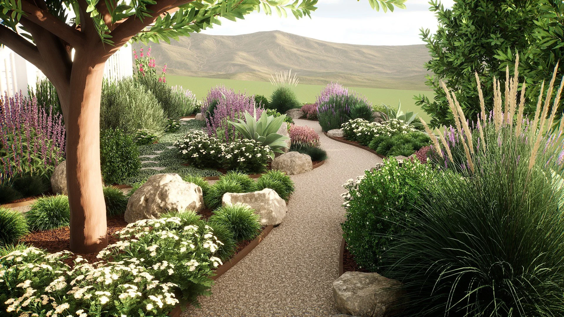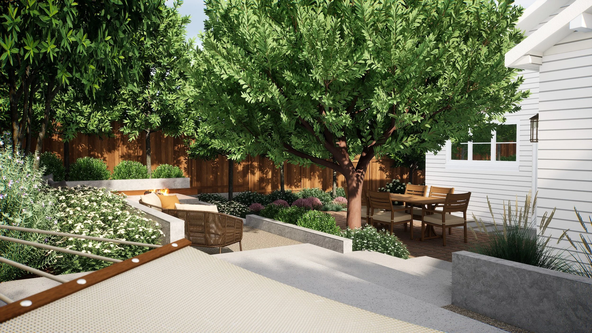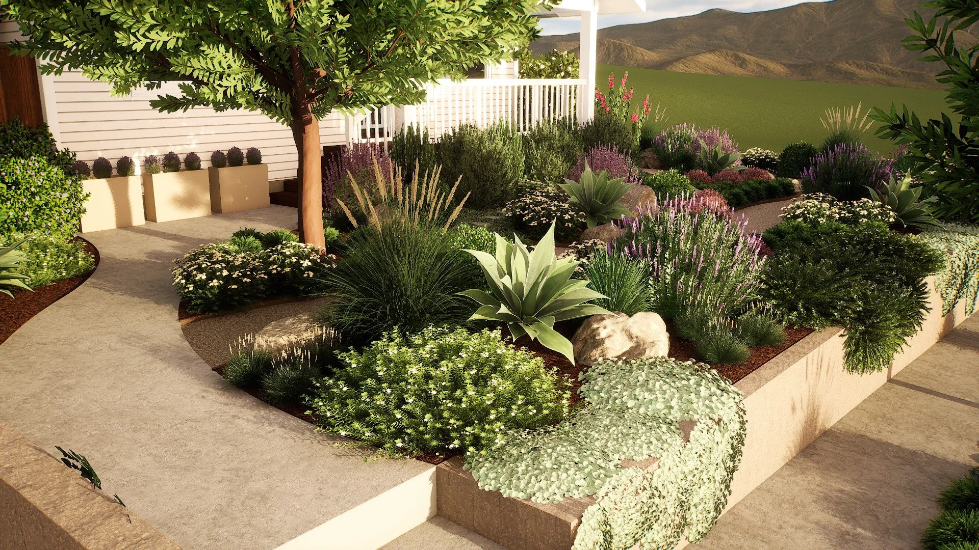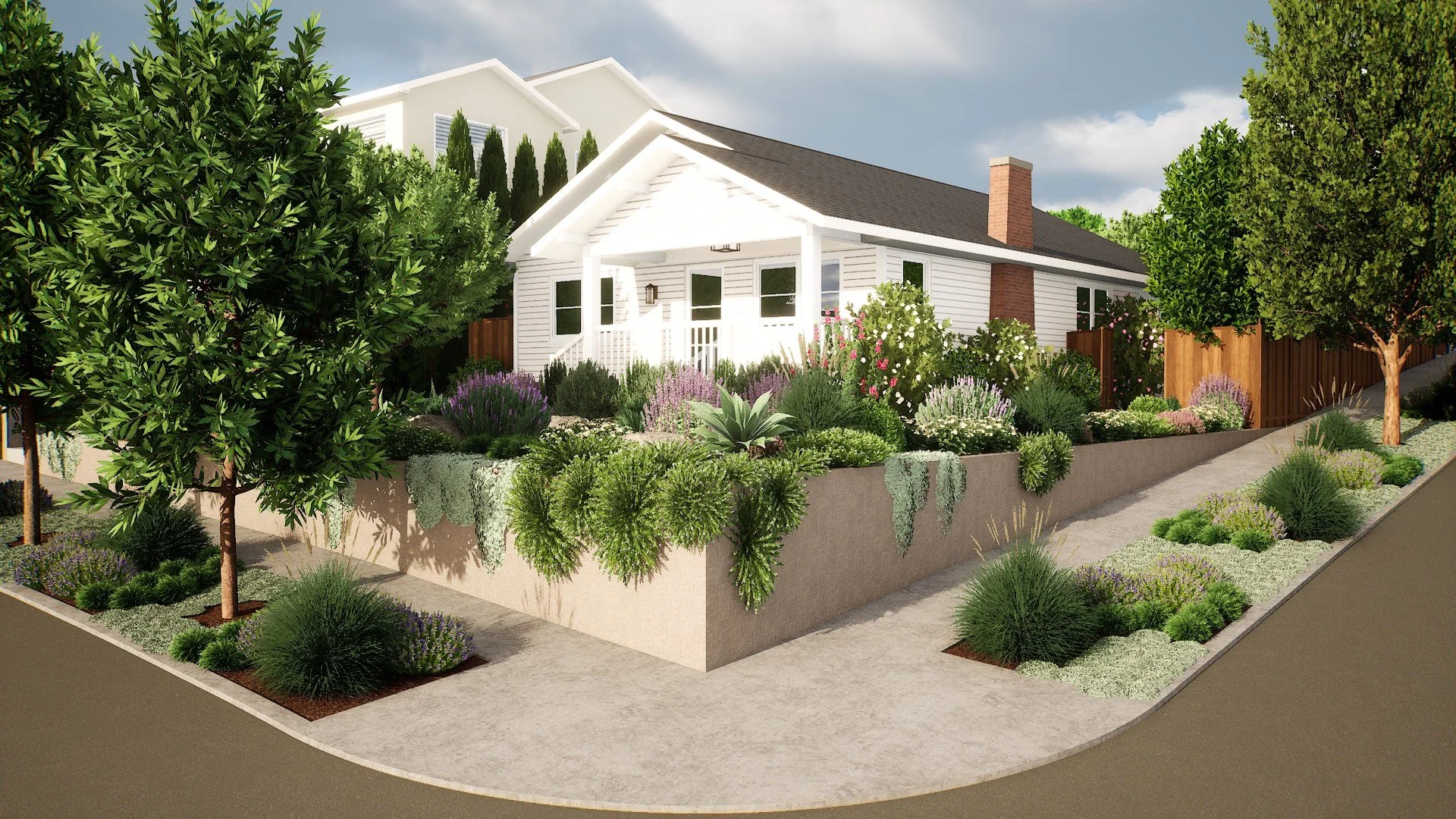 A front and backyard reimagined as a layered, water-wise garden with Mediterranean-inspired planting and integrated outdoor living.