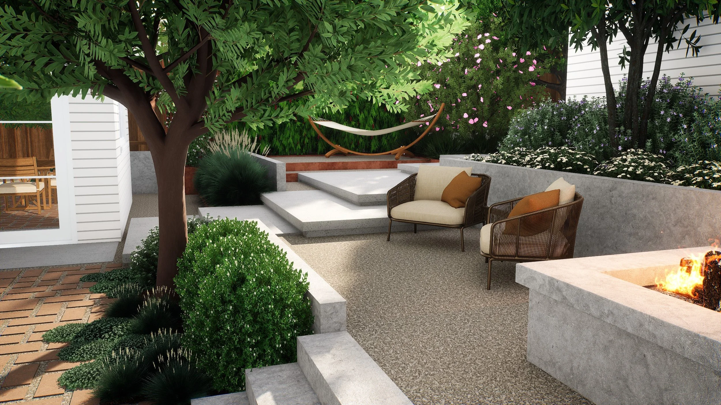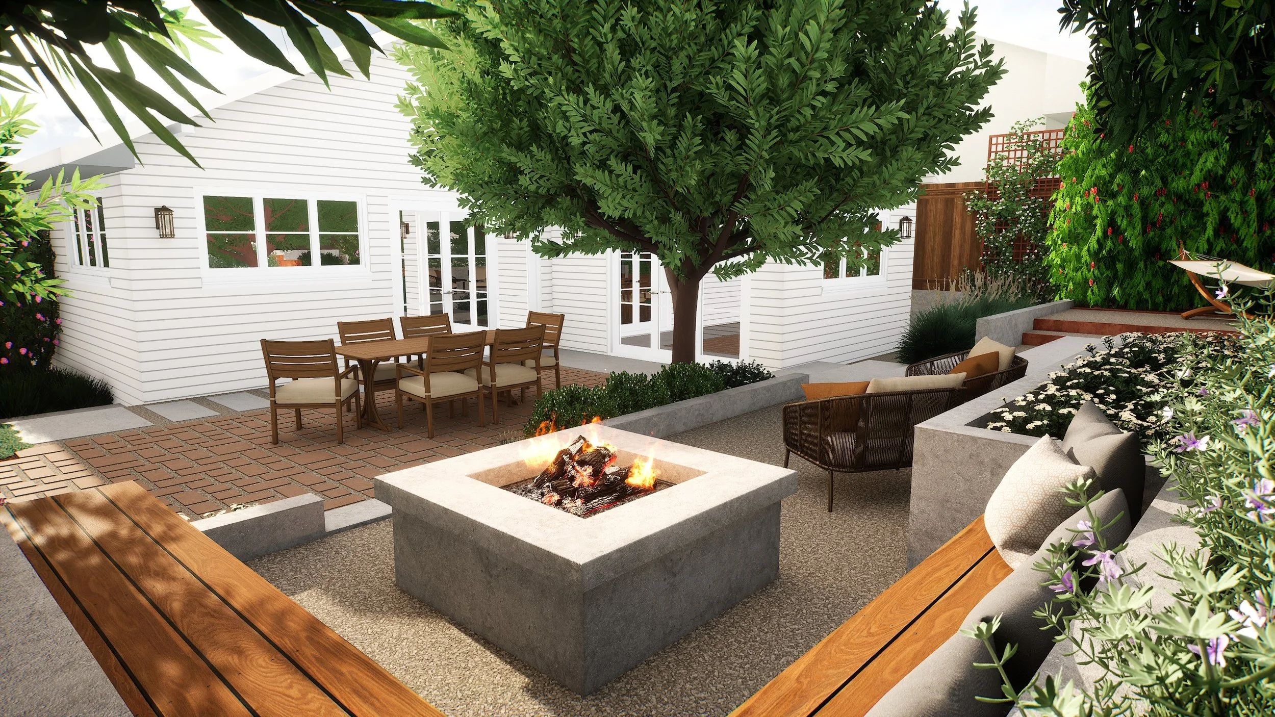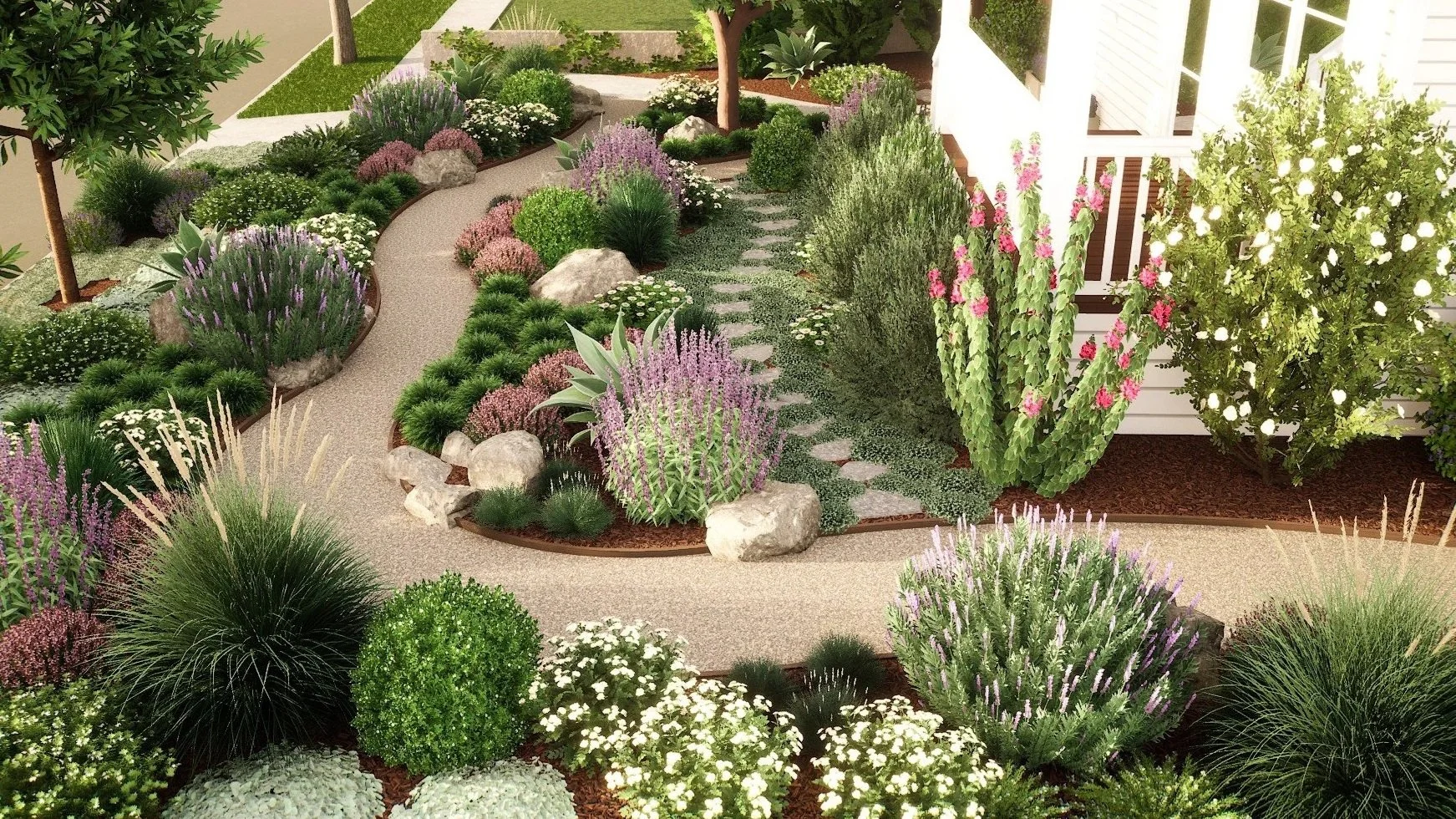 A front and backyard reimagined as a layered, water-wise garden with Mediterranean-inspired planting and integrated outdoor living.