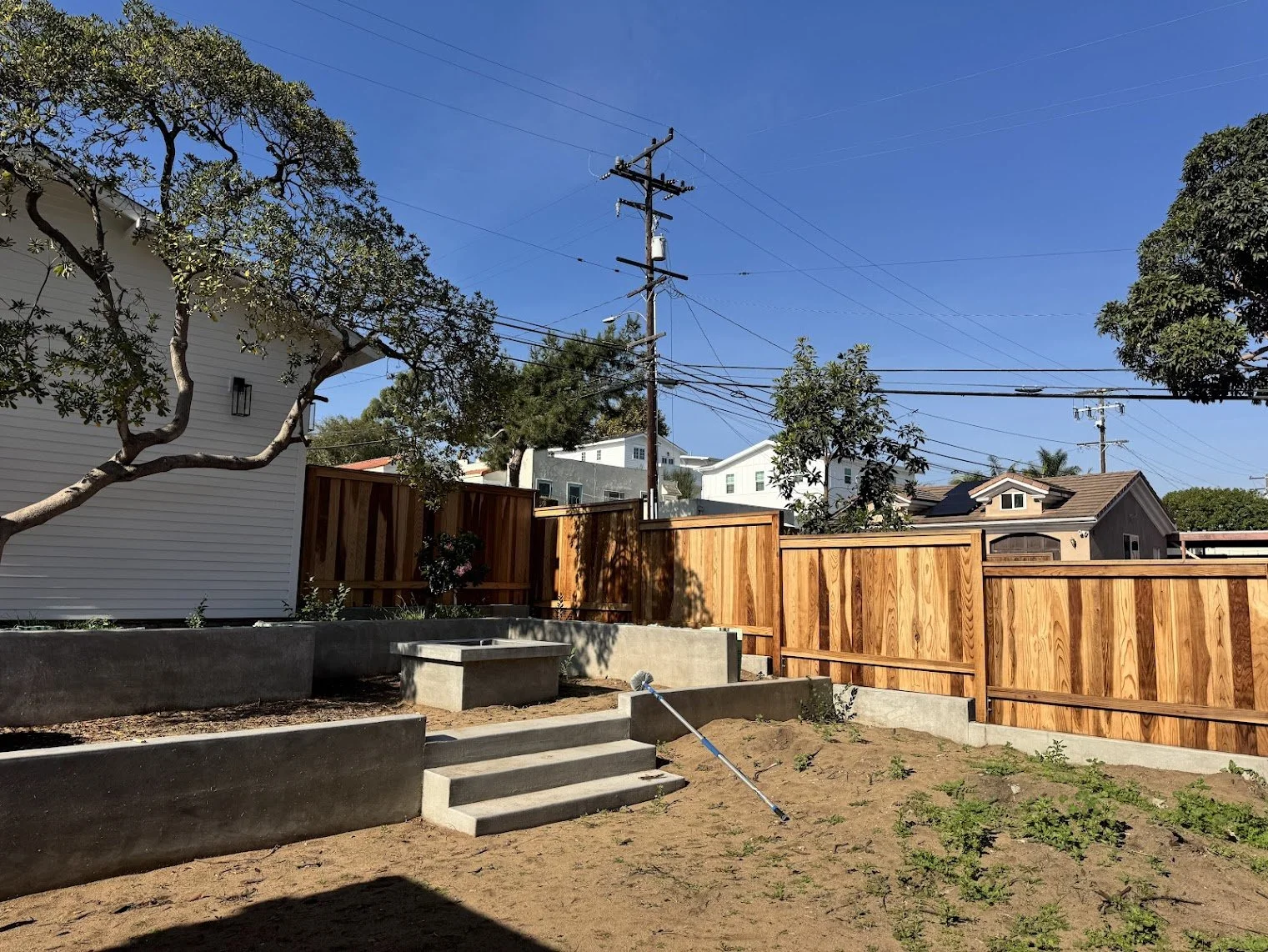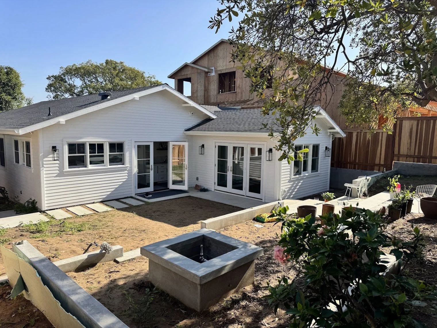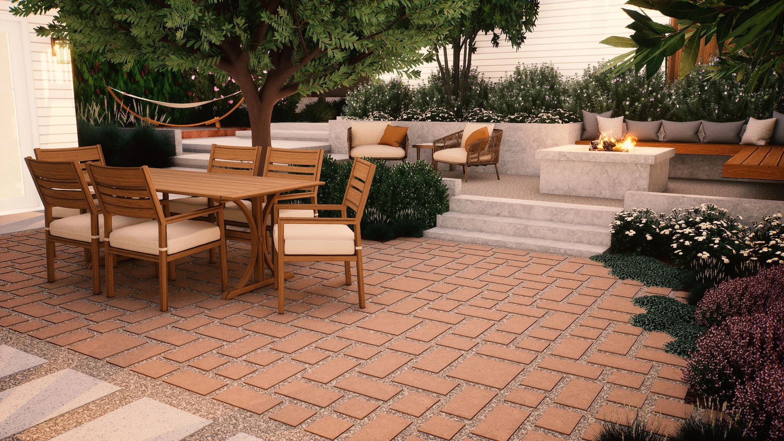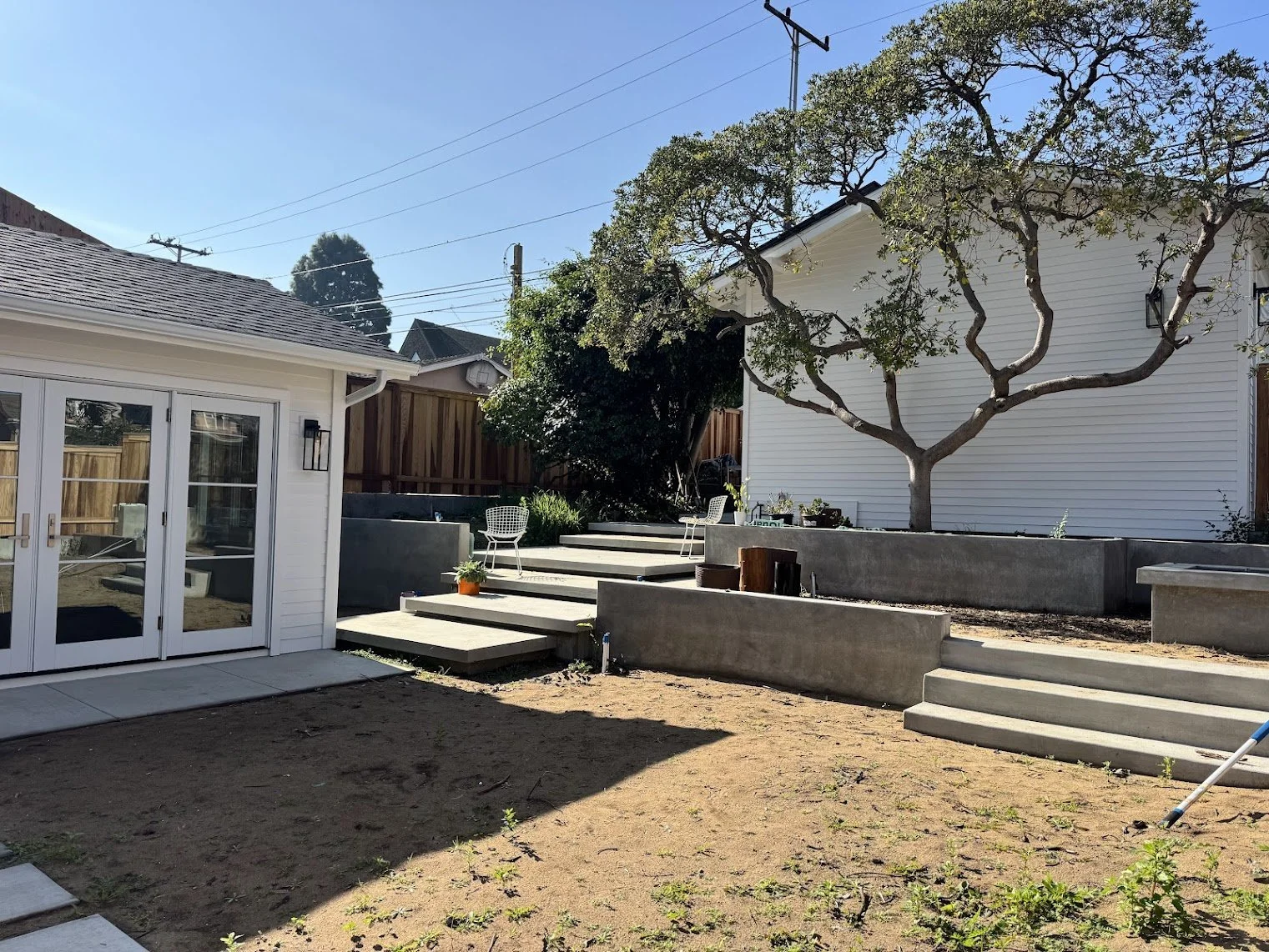 A front and backyard reimagined as a layered, water-wise garden with Mediterranean-inspired planting and integrated outdoor living.